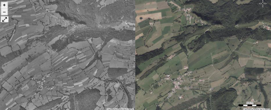 - La perte de parcelles agricoles au profit de l’extension de la forêt est limitée. Cela concerne toujours des petites parcelles sur des versants peu accessibles, pentus et ombragés. A l’est du village de Neuvier, plusieurs dizaines d’hectares très embroussaillés en 1958 sont maintenant ouverts et servent de pâture. Il est évident que, sans les exigences des cahiers de charges des AOP Comté et Morbier (chargement à l’hectare, pâturage…) et une rémunération convenable du lait, ces milieux se seraient refermés.