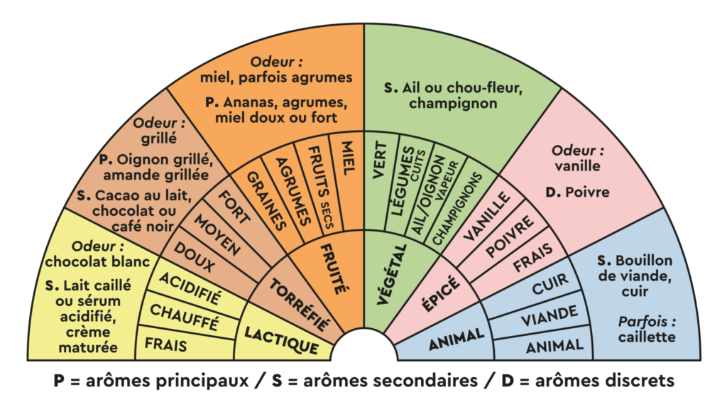 Le dégustateur perçoit d’abord des notes de miel, d’ananas qui côtoient celles de l’oignon ou de l’amande grillés, ou même parfois celles, plus fortes, de chocolat noir. Puis, les notes lactées plus discrètes adoucissent l’ensemble. L’affinage long de ces Comté les conduit vers des arômes de bouillon de viande, de cuir, d’ail ou de champignon qui enrichissent et corsent le tout.